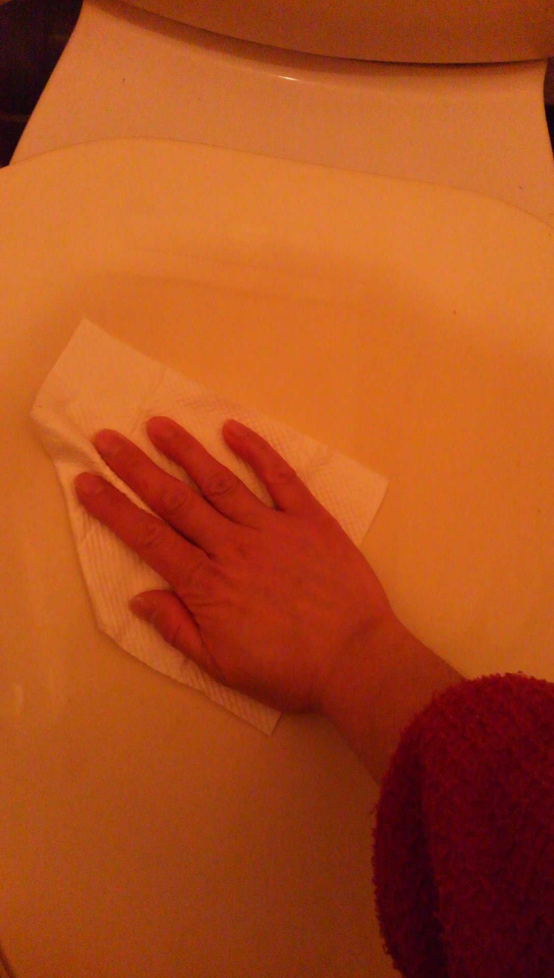 便座表面が綺麗になったか どうかを手の平を使って触りながら確認していきます。