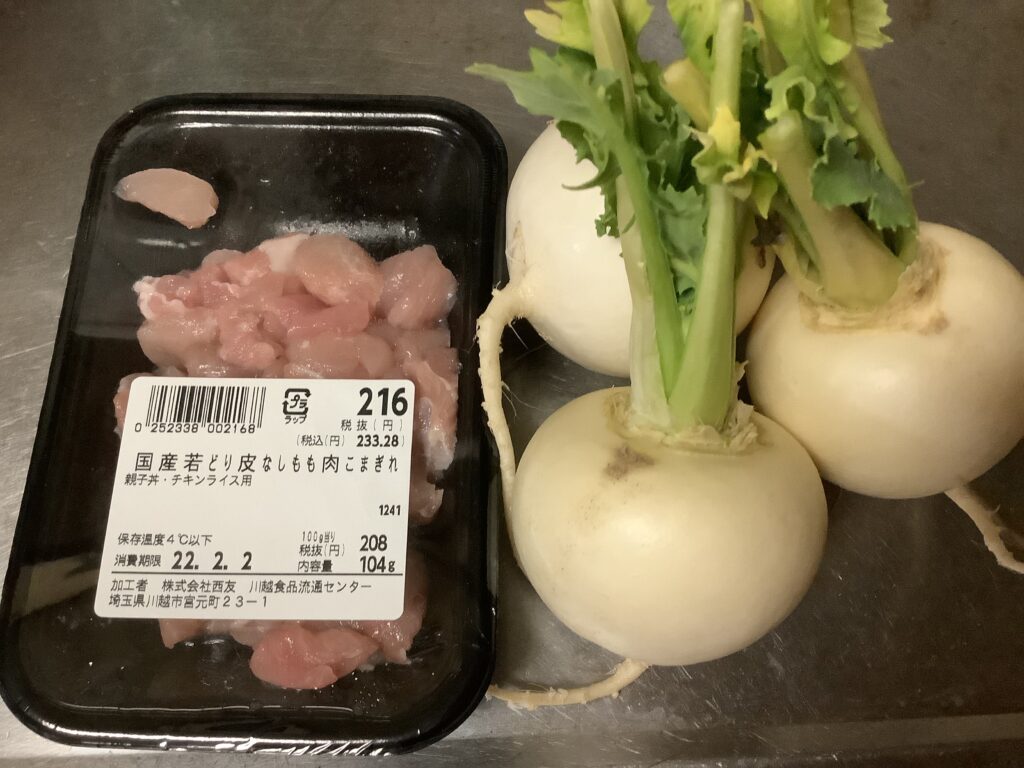 (1)かぶは皮をむき4等分に切る。(大きいかぶは6等分に切りましょう)
