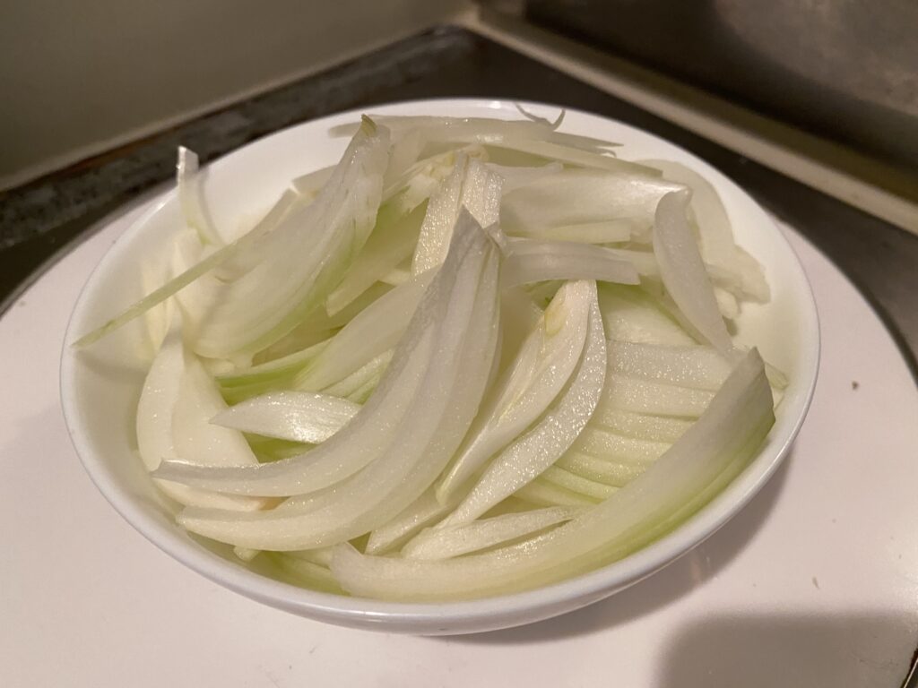 2.玉ねぎは、繊維に沿って薄切りにしておき、(B)を混ぜ合わせておく。